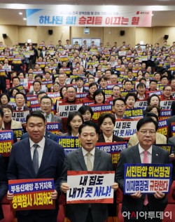 장동혁 국민의힘 대표와 송언석 원내대표를 비롯한 참석자들이 27일 국회 의원회관에서 열린 국민의힘 전국 광역의원 및 강원도 기초의원 연수에서 이재명 정부 부동산 정책을 규탄하는 구호를 외치고 있다.