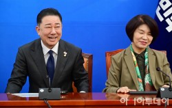 김병기 더불어민주당 원내대표가 28일 국회에서 열린 국정감사 대책회의에서 환하게 웃고 있다.
