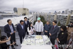 오세훈(가운데) 서울시장이 13일 서울 강남구 대치 은마아파트 옥상에서 재건축 모형 도감을 살펴보고 있다. /정재훈 기자