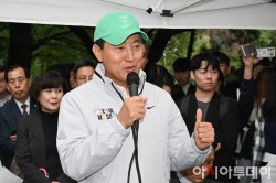 오세훈 서울시장이 13일 오전 재건축 정비계획 변경안이 통과된 서울 강남구 대치동 은마아파트를 찾아 주민 간담회를 하고 있다. /정재훈 기자