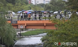 전국 대부분 지역에 비가 내린 13일 서울 종로구 청계천 광교를 우산을 쓴 시민들이 지나가고 있다. 수도권 등 중부지방은 14일 오전쯤 비가 그치겠고 강원 영동지역과 남부지방은 밤까지 비가 계속될 것으로 기상청은 전망했다. /정재훈 기자