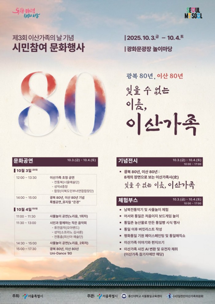 서울시가 주최하고 여러 기관과 단체가 협력한 가운데, 광복 80주년과 이산 80년을 맞아 이산가족의 아픔을 공감하고 국민적 인식을 확산하기 위한 취지로 마련됐다.