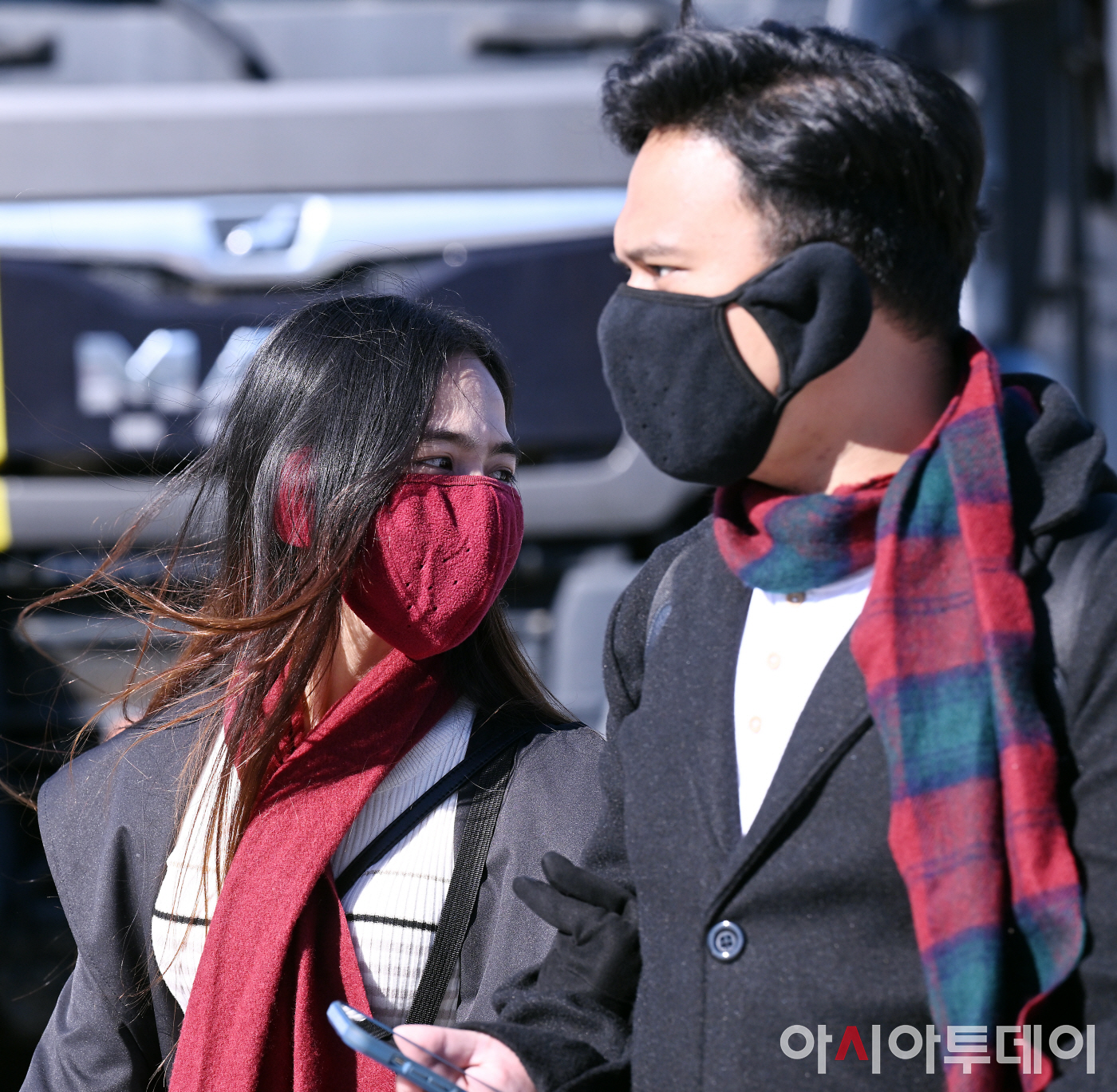 어제(26일)보다 7도나 떨어진 초겨울 날씨를 보이는 27일 오전 서울 종로구 광화문 거리에서 관광들이 추위에 대비해 목도리와 마스크를 착용하고 있다.