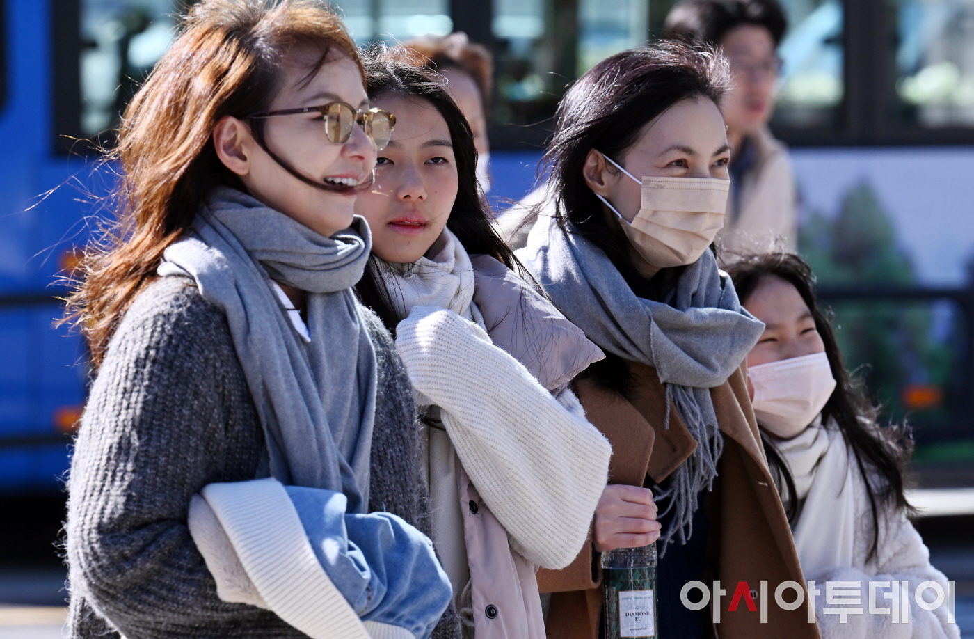 어제(26일)보다 7도나 떨어진 초겨울 날씨를 보이는 27일 오전 서울 종로구 광화문 거리에서 관광들이 추위에 대비해 목도리와 마스크를 착용하고 이동하고 있다.