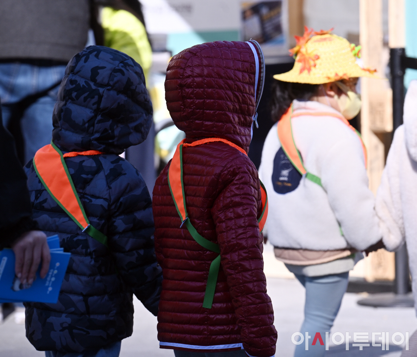 어제(26일)보다 7도나 떨어진 초겨울 날씨를 보이는 27일 오전 서울 종로구 광화문 거리에서 아이들이 추위를 피하기 위해 모자달린 겨울옷을 입고 있다.