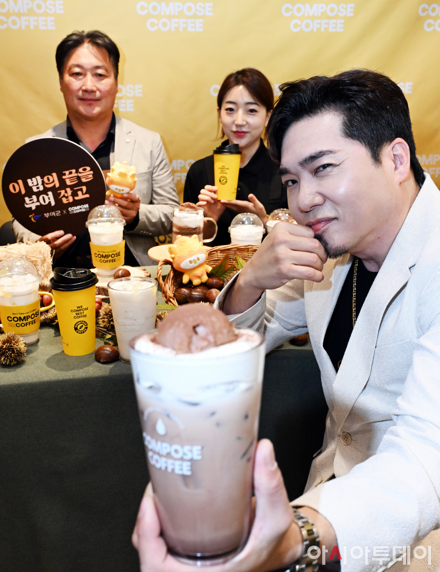 커피 프랜차이즈 브랜드 컴포즈커피는 27일 서울 종로6가점에서 가수 김조한과 부여군 마케팅팀장, 홍보요원이 부여 특산물인 ‘부여 밤’을 활용한 신메뉴 2종을 선보였다.