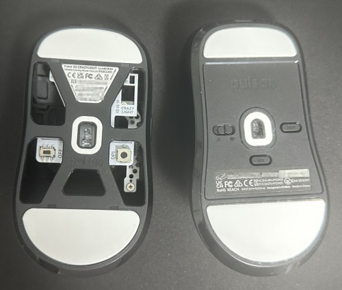| 펄사 'X2 크레이지라이트(X2 CL)' 미디엄과 펄사 텐즈 마우스 바닥면 비교 /김휘권 기자 |