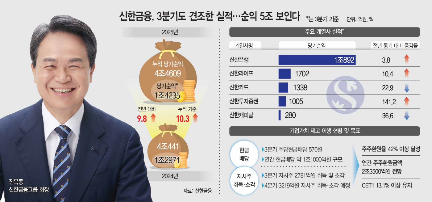 신한금융은 3분기에도 전년 대비 10%에 달하는 실적 개선세를 기록했지만, 그룹사 전체를 보면 진옥동 회장의 고민도 클 것으로 보인다. 맏형 신한은행은 정부의 가계대출 관리 강화 속에서도 기업금융 중심으로 안정적인 이익 창출력을 보여줬고, 신한라이프는 비은행 자회사 중 가장 높은 수익성으로 그룹 실적을 견인하고 있다.