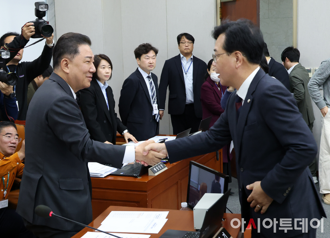 김병기 국회 운영위원장과 송언석 국민의힘 원내대표가 29일 국회에서 열린 운영위원회 전체회의에 참석하하며 인사를 나누고 있다.