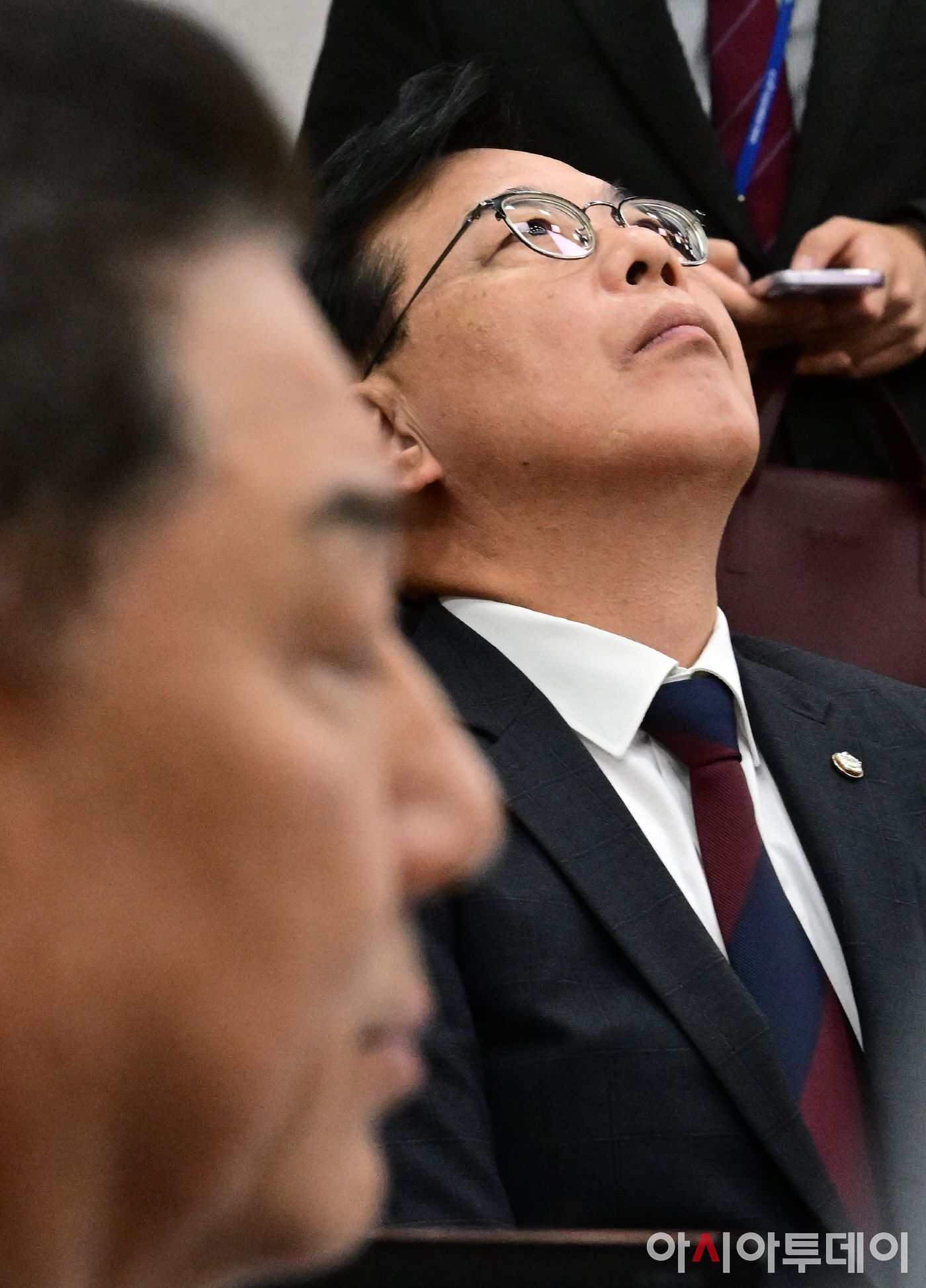 송언석 국민의힘 원내대표가 29일 국회에서 열린 국회운영위원회 전체회의에서 허공을 바라보고 있다. 왼쪽은 김병기 국회 운영위원장.