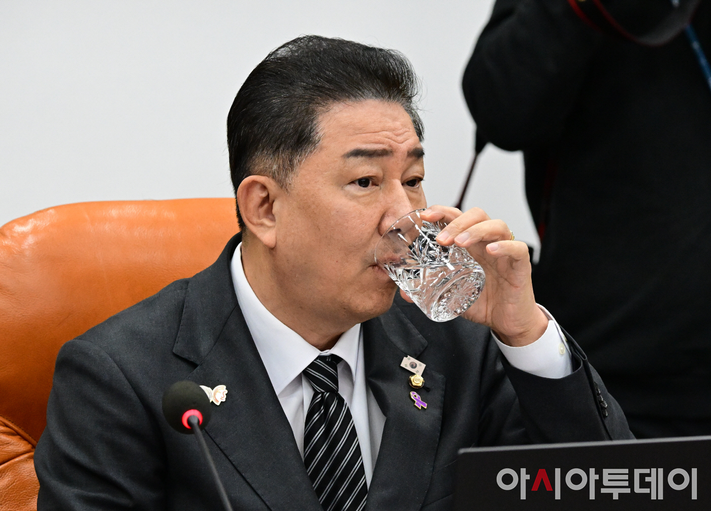 김병기 국회 운영위원장이 29일 국회에서 열린 국회운영위원회 전체회의에서 물을 마시고 있다.