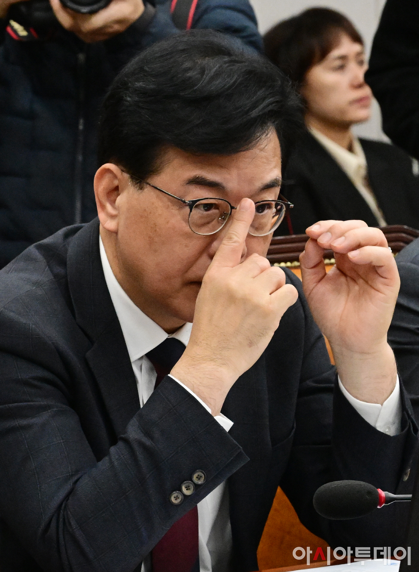 송언석 국민의힘 원내대표가 29일 국회에서 열린 국회운영위원회 전체회의에서 안경을 치켜 올리고 있다.