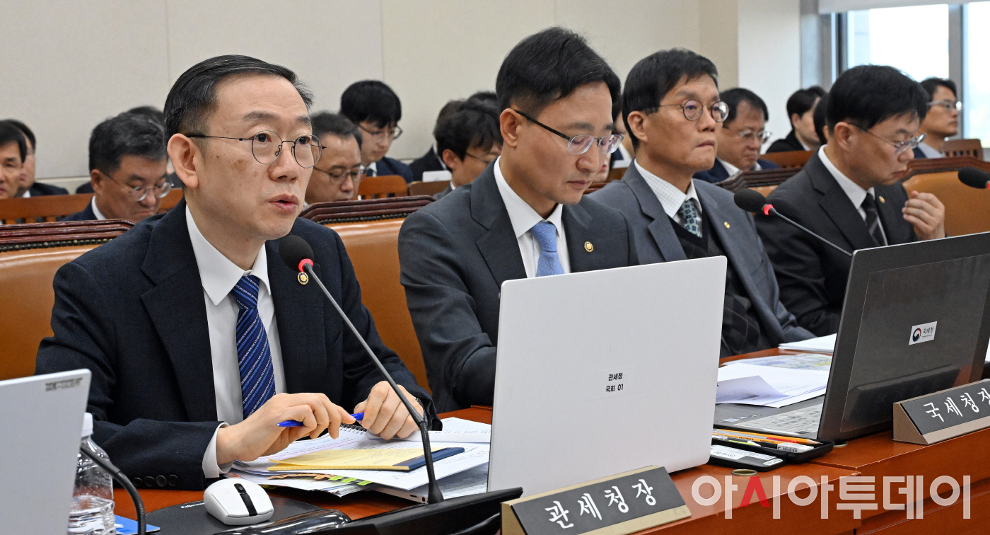 이명구 관세청장이 29일 국회 기획재정위원회에서 열린 한국은행·국세청·관세청 등에 대한 종합감사에서 의원 질의에 답하고 있다.