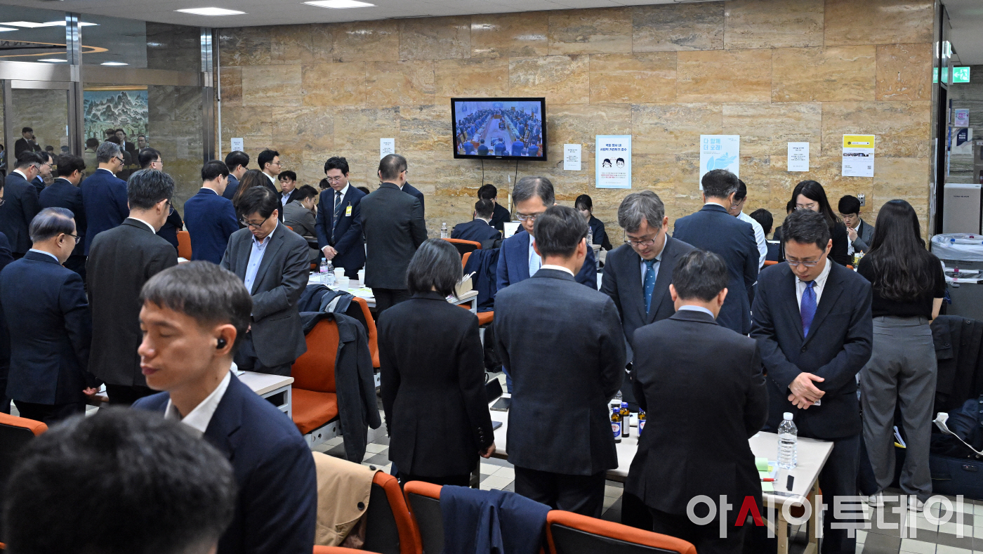 29일 국회에서 열린 국정감사에서 피감기관 직원들이 10시29분에 10.29 이태원참사 희생자를 추모하는 사이렌에 맞춰 묵념하고 있다.