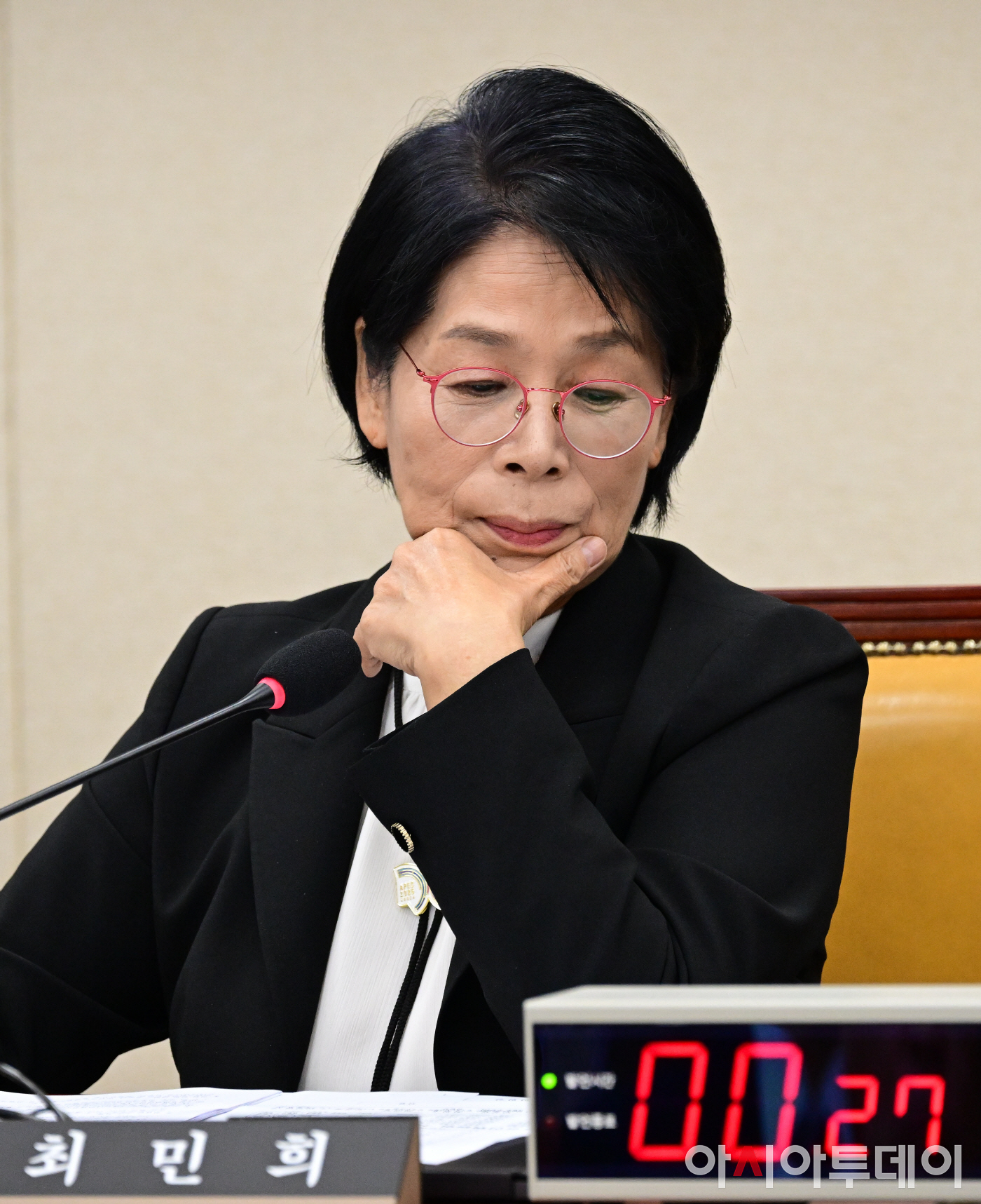 [포토][2025 국감] 사퇴 요구 발언 듣는 최민희 국회 과방위원장